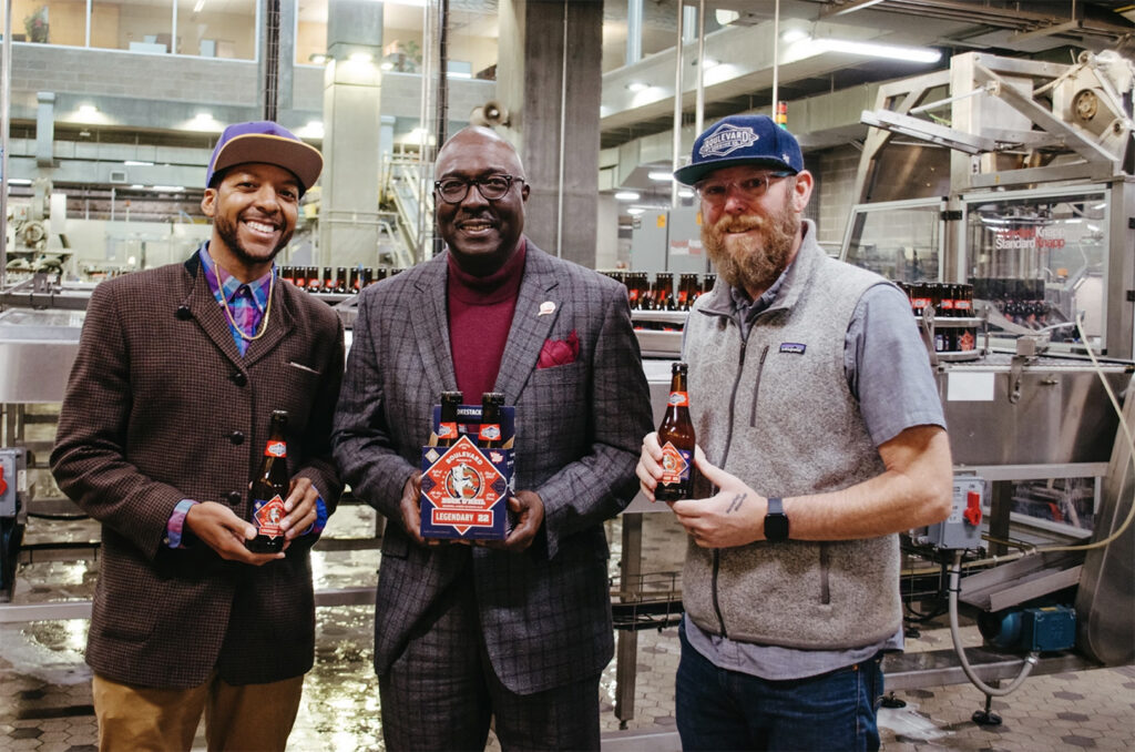 Kemet Coleman, co-founder of Vine Street Brewing; Bob Kendrick, president of the Negro Leagues Baseball Museum; and Adam Hall, Boulevard and Duvel/Moortgot; photo courtesy of Vine Street Brewing