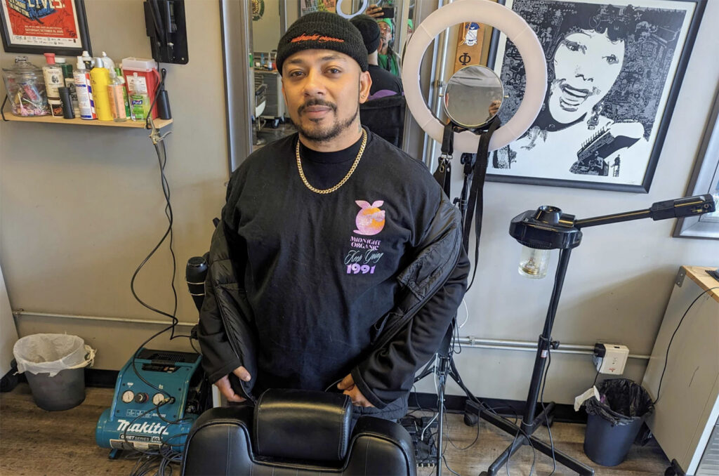 Ricardo Becerra standing at his booth at the Directors Cut Barbershop on the east end of 18th and Vinem; photo by Lawrence Brooks IV, KCUR