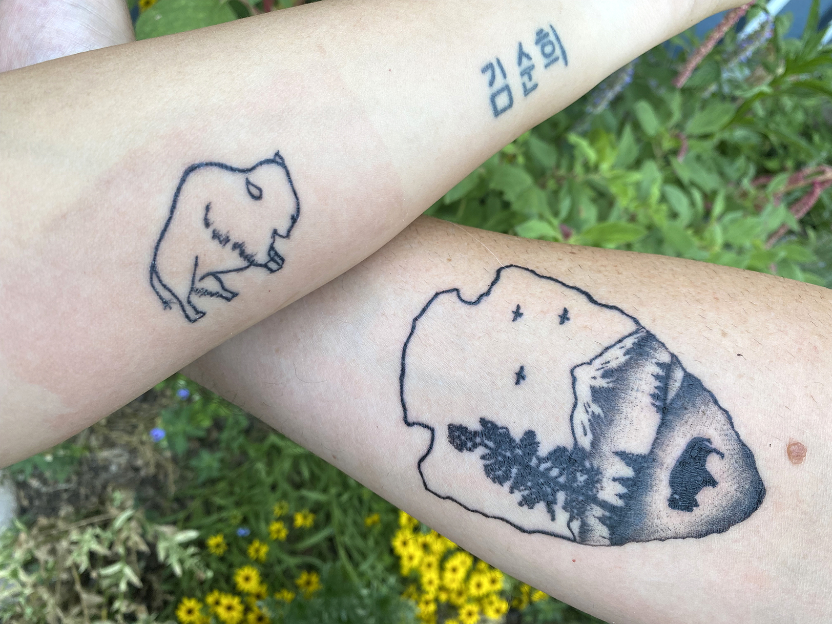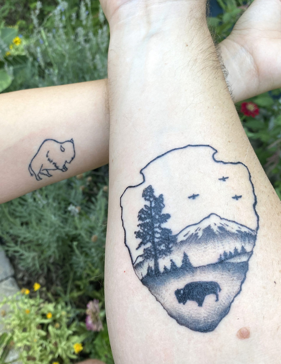 The two tattoos are connected, though not the same. Barham’s ink is a small bison on her left arm, and Buek had the national park logo — which prominently features a bison — etched on his right forearm.