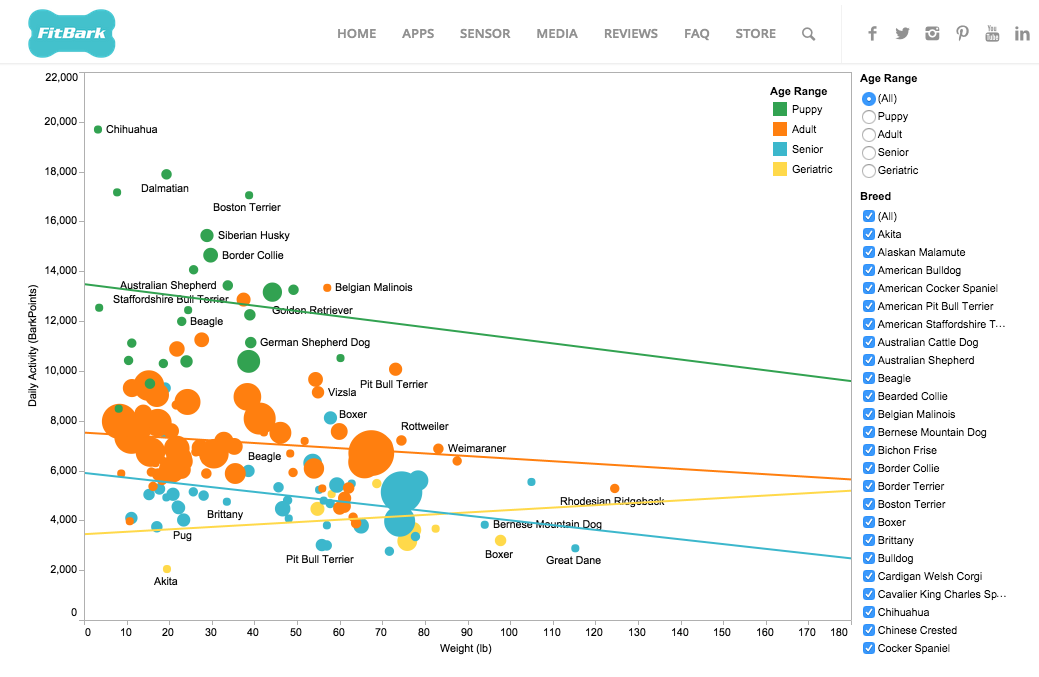 The database colorfully shares with users such information as breeds’ average activity by age and weight, breeds’ sleeping patterns, dogs’ sleeping efficiency by weight and age, puppies’ activity and many more metrics. Rossi said that the database also enhances FitBark’s product by offering users more information on how their dogs compare to other similar breeds. It also makes people more curious about their pets’ health, which increases awareness of the product, he said.