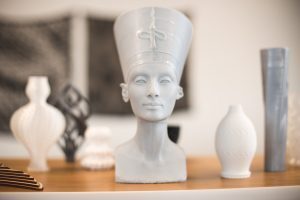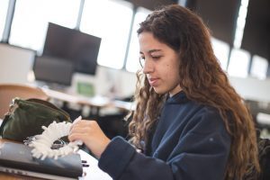 Walking through the studio reveals a cornucopia of creativity. With symphony beeping machines to offer a score, students mingle amid rows of 3-D printed animal skulls and icons like Nefertiti and the Eiffel Tower. As one student digitally drafts a teapot lid, another uploads a table design that’s being cut via laser. Black and white tapestries rest atop the hulking digital loom while an instructor challenges a student to tweak the dimensions of a project.