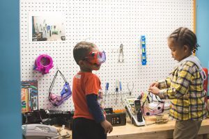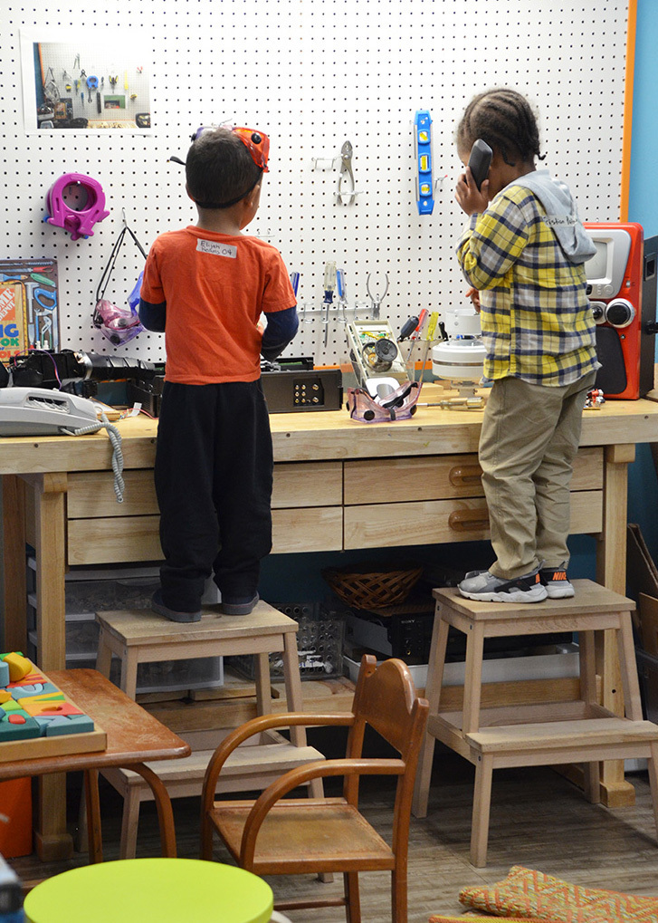 Two small boys are standing on stools at a workbench, pretending to talk on outdated handset telephones. They might not yet know how the phones work, but they’re clearly familiar with how to take them apart.