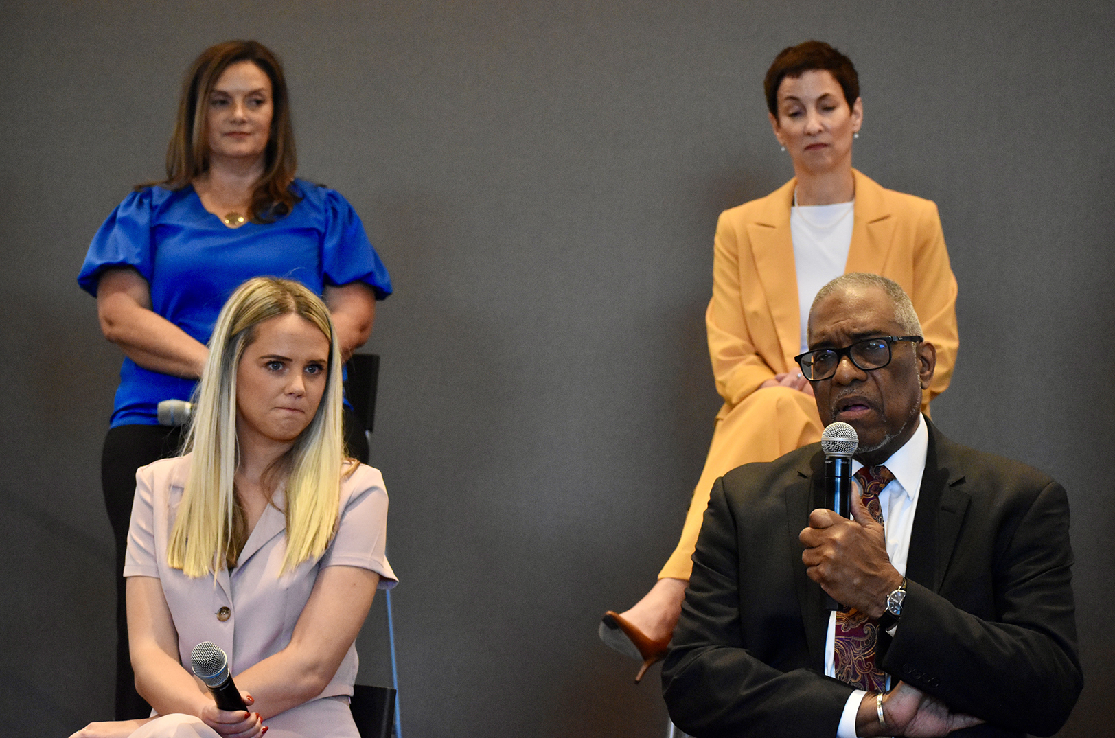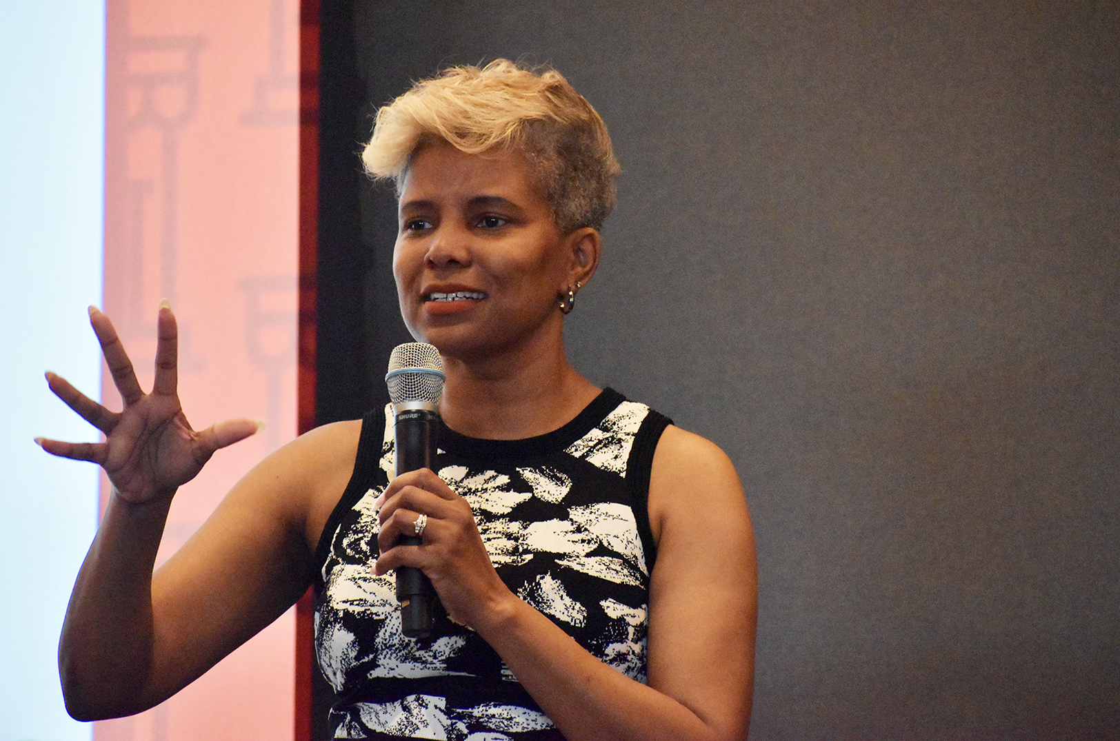Elaina Paige Thomas, The Next Paige Agency, speaks during a panel conversation featuring the 2024 finalists for the “Mr. K” Award; photo by Nikki Overfelt Chifalu, Startland News