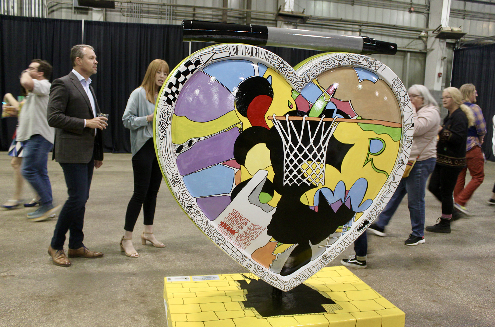 KCK-based mix-media artist John Pannell’s entry — “Alley-Oop” — also evoked nostalgia. His pop art, graffiti-inspired heart is an ode to his childhood, especially playing basketball. The heart includes his birthdate on the marker, the Chicago Bulls’ three-peat years, and his daughter’s signature.