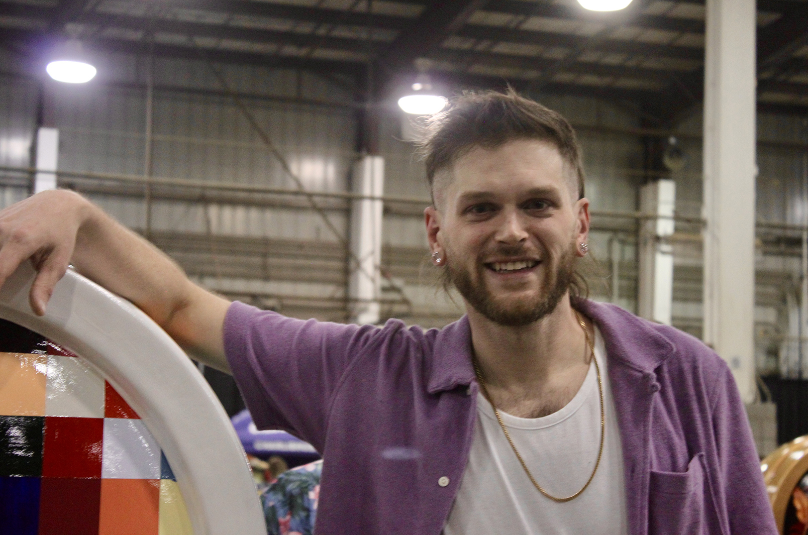 Skiggity with his piece “Blurring Together” at the 2024 Parade of Hearts unveiling event; photo by Nikki Overfelt Chifalu, Startland News
