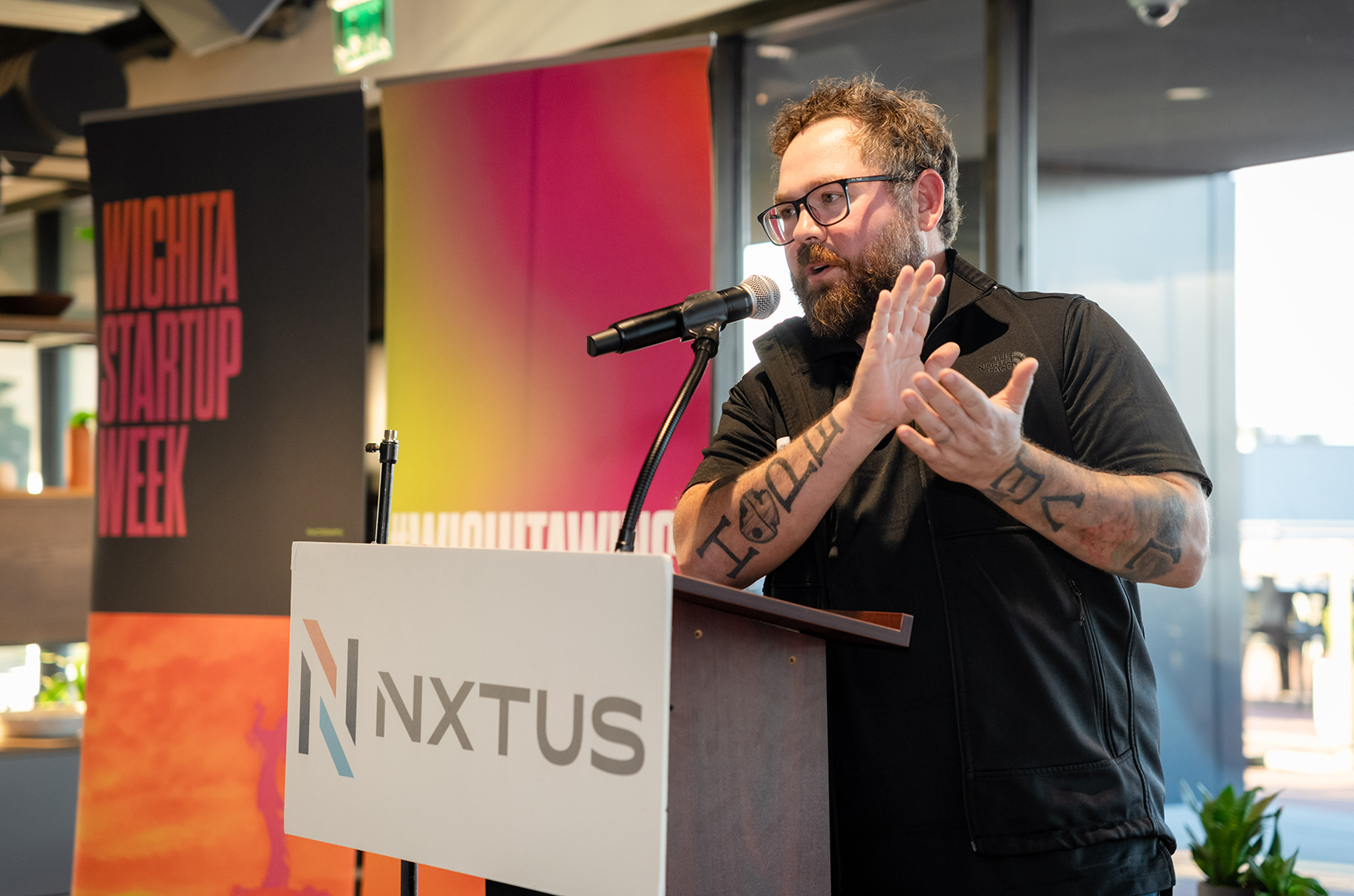 Mark Lukenbill, Mpruv Sports, pitches Nov. 15 at Cargill Protein Headquarters for the 2023 NXTSTAGE Enterprise Engagement Series; photo courtesy of NXTUS
