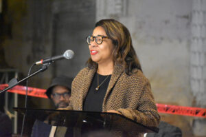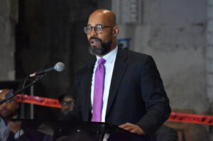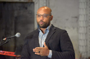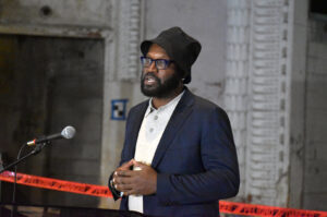 Shomari Benton, co-founder of the Vine Street Collaborative, speaks during a groundbreaking event at the Boone Theater; photo by Taylor Wilmore, Startland News