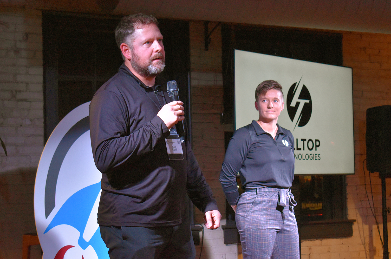Nick Gicinto and Conner Hazelrigg, Hilltop Technologies, pitch during LaunchKC’s 2024 event; photo by Taylor Wilmore, Startland News