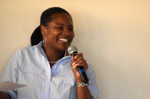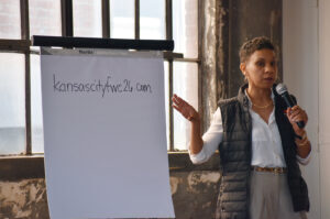 Nia Webster, assistant director of Neighborhood Services Department, which oversees the KC BizCare Office, opens a town hall event organized by KCMO’s Small Business Task Force; photo by Nikki Overfelt Chifalu, Startland News