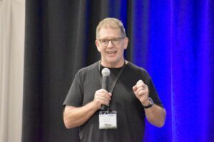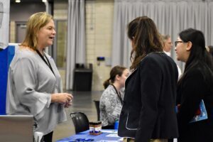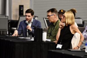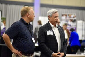 Craig Mason, founder of Kansas City-based Myndset, chats with the co-founders of Pet Portal AI during the BioKansas Startup Pitch Competition at Innovation Festival; photo by Nikki Overfelt Chifalu, Startland News