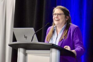 Amie Norton with Manhattan-based CustomNano — which is unlocking the potential of nano eggshells to combat pests in stored products — was named the second-place finisher. This was the first pitch competition for Norton, who is conducting research at Kansas State University and was encouraged by her mentors at the school’s Center for Entrepreneurship Accelerator program to join the event. She’s hoping to make connections through the conference who can help her commercialize her product, Norton said.