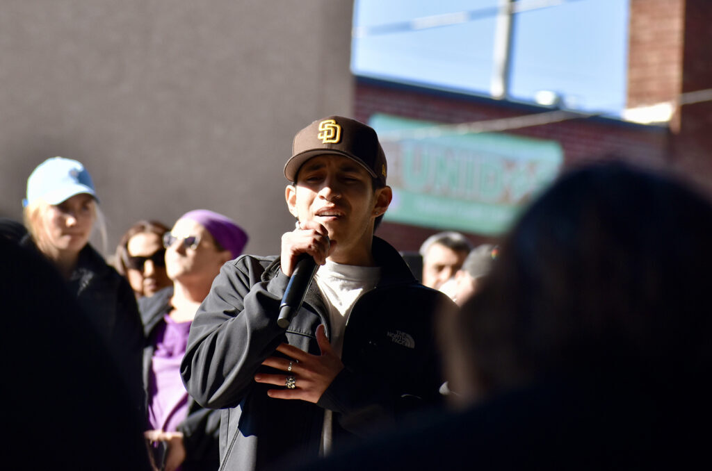 Danny Soriano sings during a February 2025 Unidos Rally for Immigrants and LGBTQIA+ Rights; photo by Nikki Overfelt Chifalu, Startland News