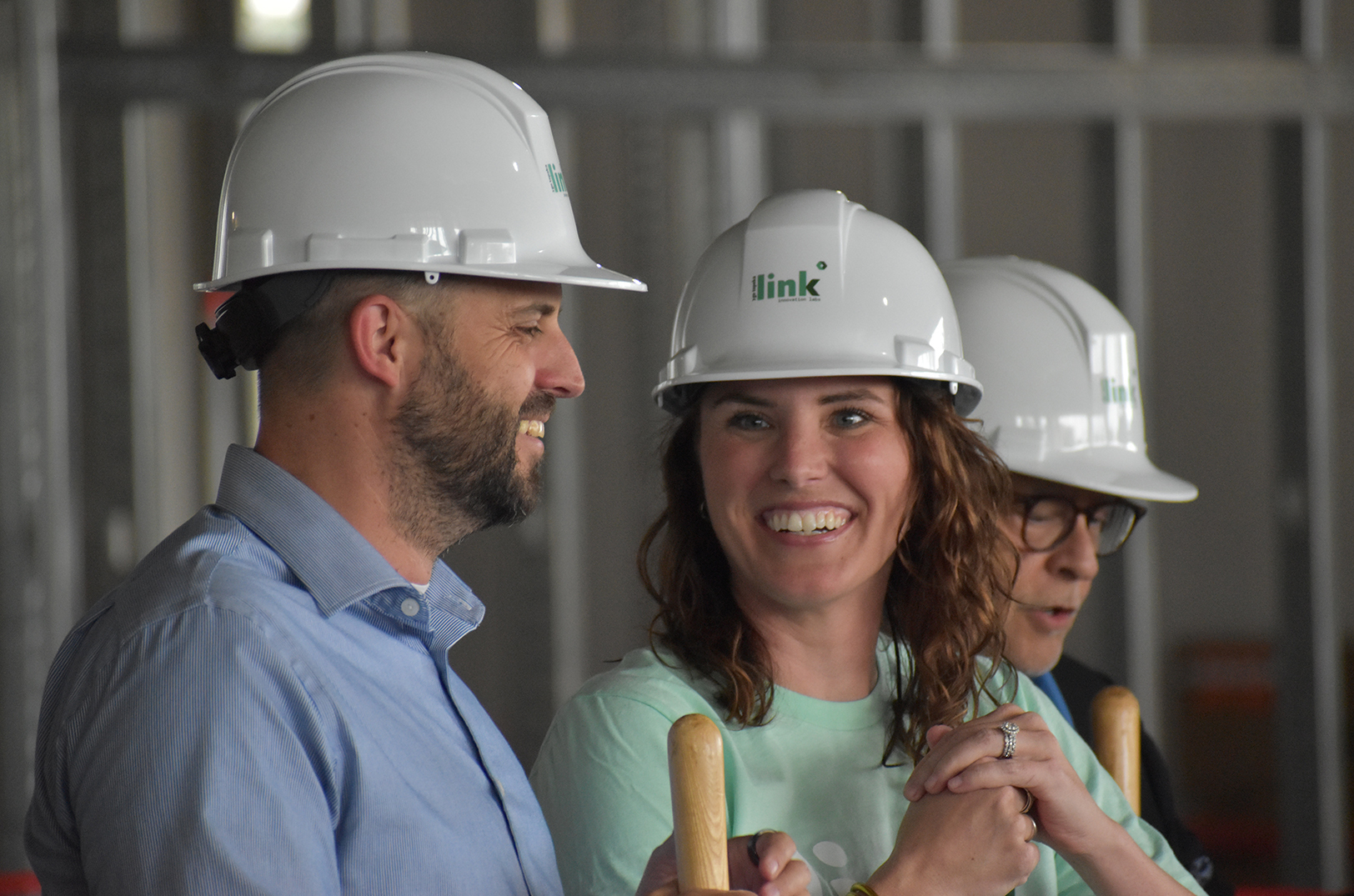 Lindsay Lebahn, director at Plug and Play Topeka, shares a laugh with community partners during a June 2025 groundbreaking event for Link Innovation Labs in Topeka; photo by Tommy Felts, Startland News
