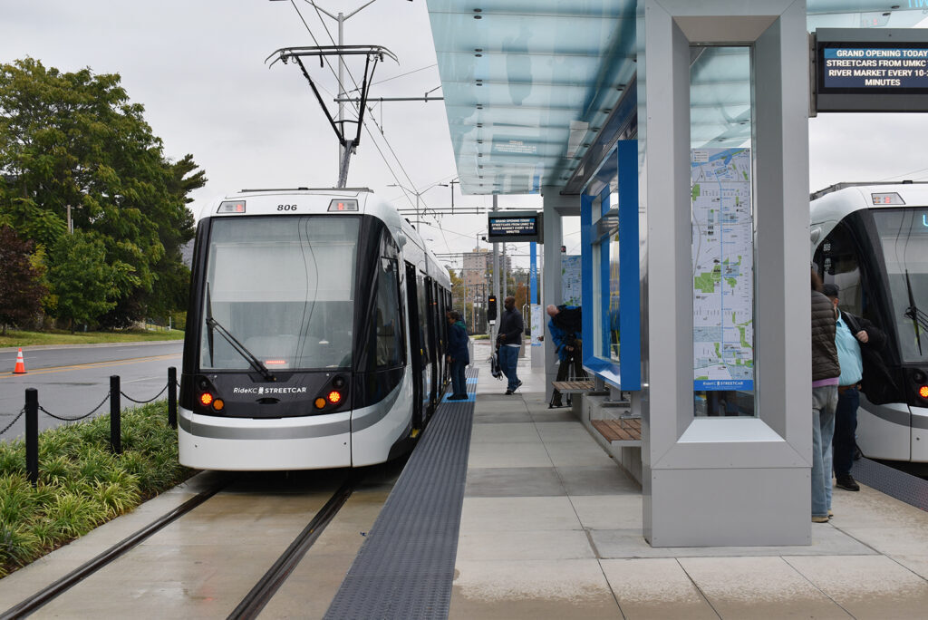 Passengers board and disembark streetcars at the UMKC stop on opening day of the KC Streetcar’s Main Street extension; photo by Taylor Wilmore, Startland News