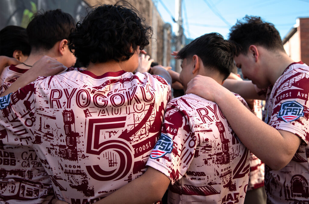 Students from Ryogoku Soccer Academy huddle while wearing limited-edition jerseys made by MADE MOBB in spring 2025 for a Copa de Calle street soccer tournament and festival; courtesy photo