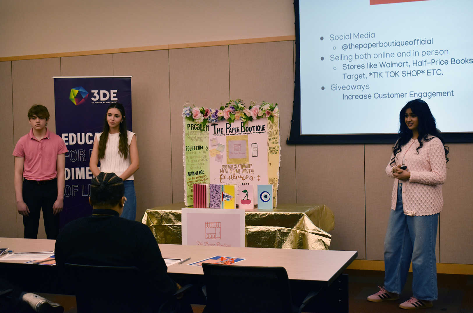 Olathe East High School students Hayden Shaver, Lillian Bryant, and Harkiran Kaur present their business concept, Paper Boutique, during the 3DE Innovators Showcase; photo by Taylor Wilmore, Startland News