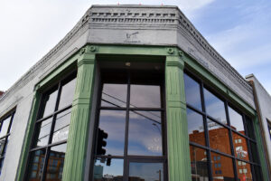 The Afterword (1834 Grand Blvd) and former Guevel (1828 Grand) buildings in mid-October with a “For sale or lease” banner along the Grand side; photo by Nikki Overfelt Chifalu, Startland News
