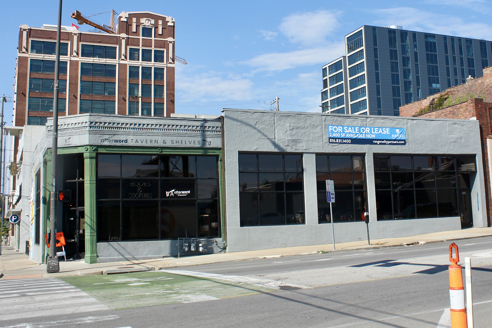 The Afterword (1834 Grand Blvd) and former Guevel (1828 Grand) buildings in mid-October with a “For sale or lease” banner along the Grand side; photo by Nikki Overfelt Chifalu, Startland News