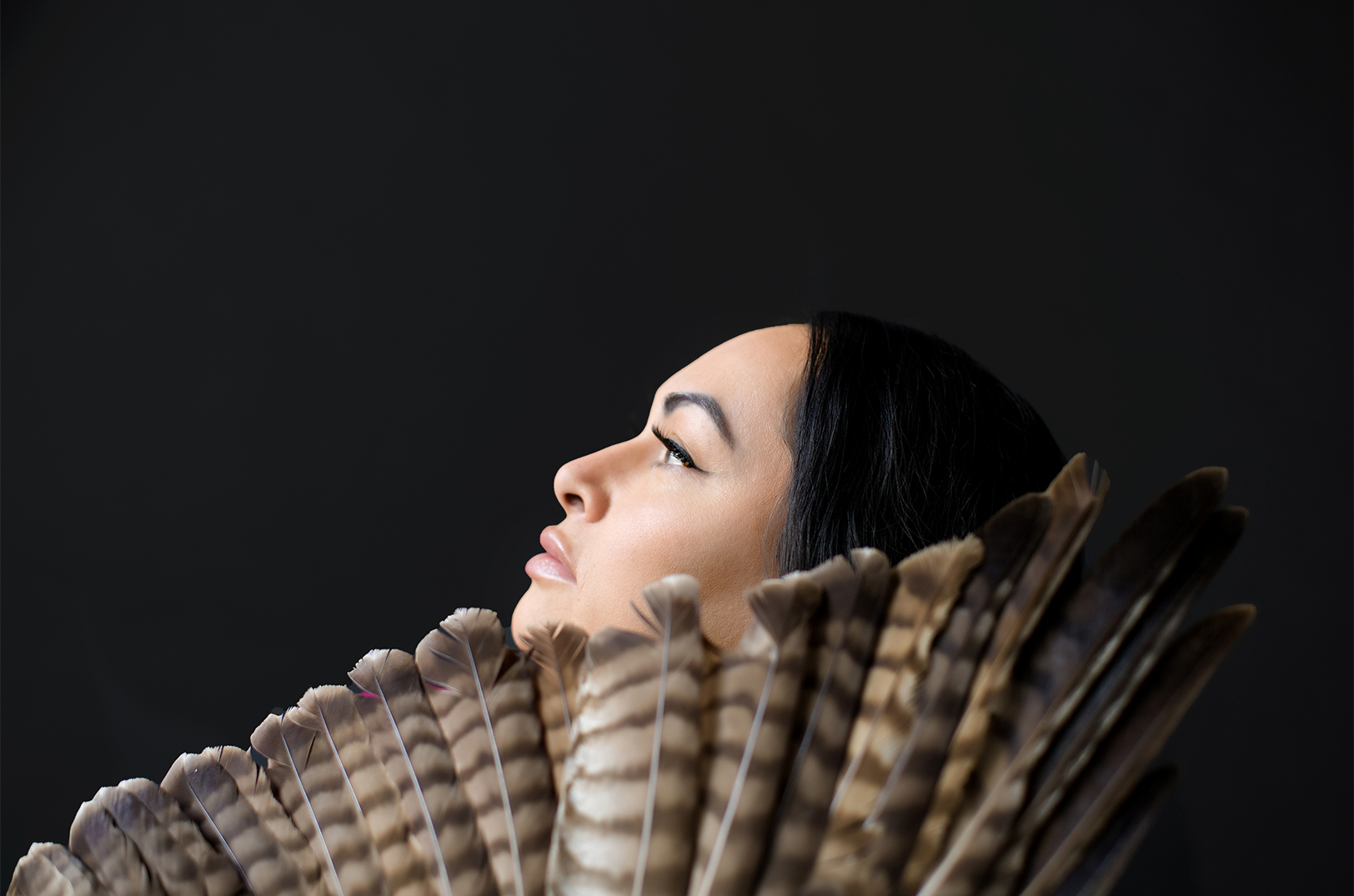 Alex Villalobos-McAnderson with a hawk wing, representing the Kansas healer’s rebirth; photo by Whitney Warne, Ivy House Photography