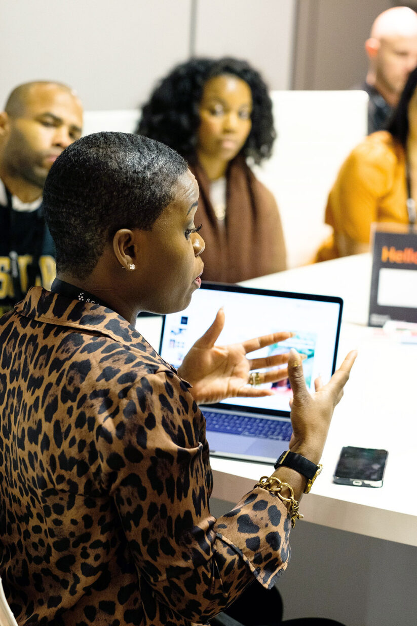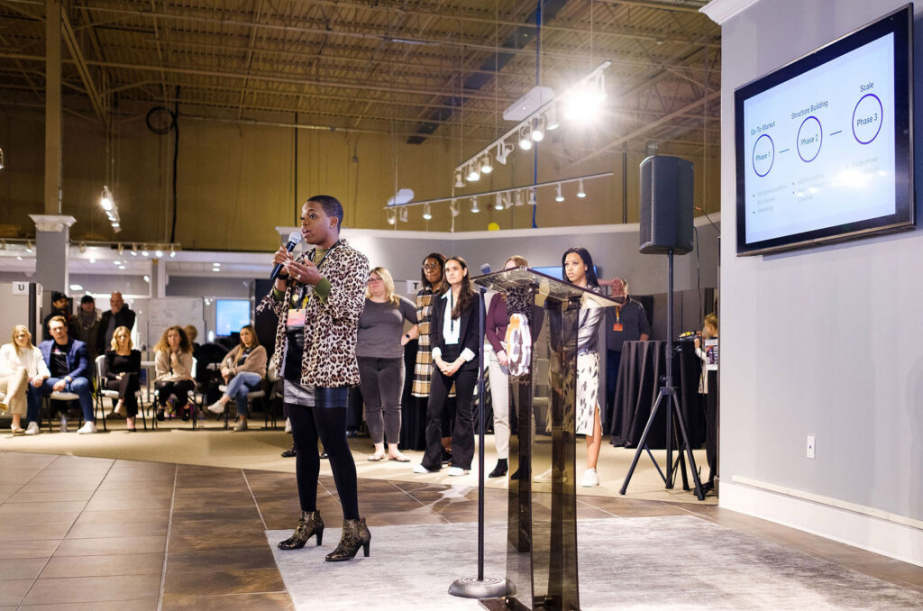 Chrystal Graves, All Hair Academy, discusses her business idea during Missouri Startup Weekend 2023; photo by Max Hammock Photography