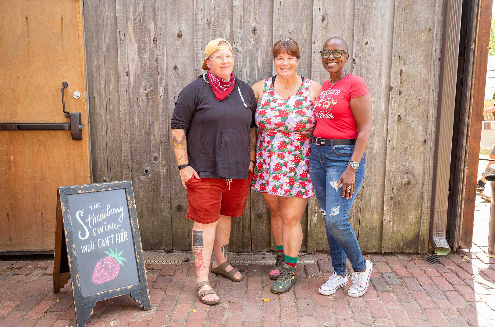 Faye Woods, founder of Red Hare Leather; Katie Mabry van Dieren, founder of the Strawberry Swing; and Clarissa Knighten, founder of Rissa’s Artistic Design; during the Emerging Makers Showcase Competition at Alexander Majors Barn; photo by Bobby Burch, AltCap