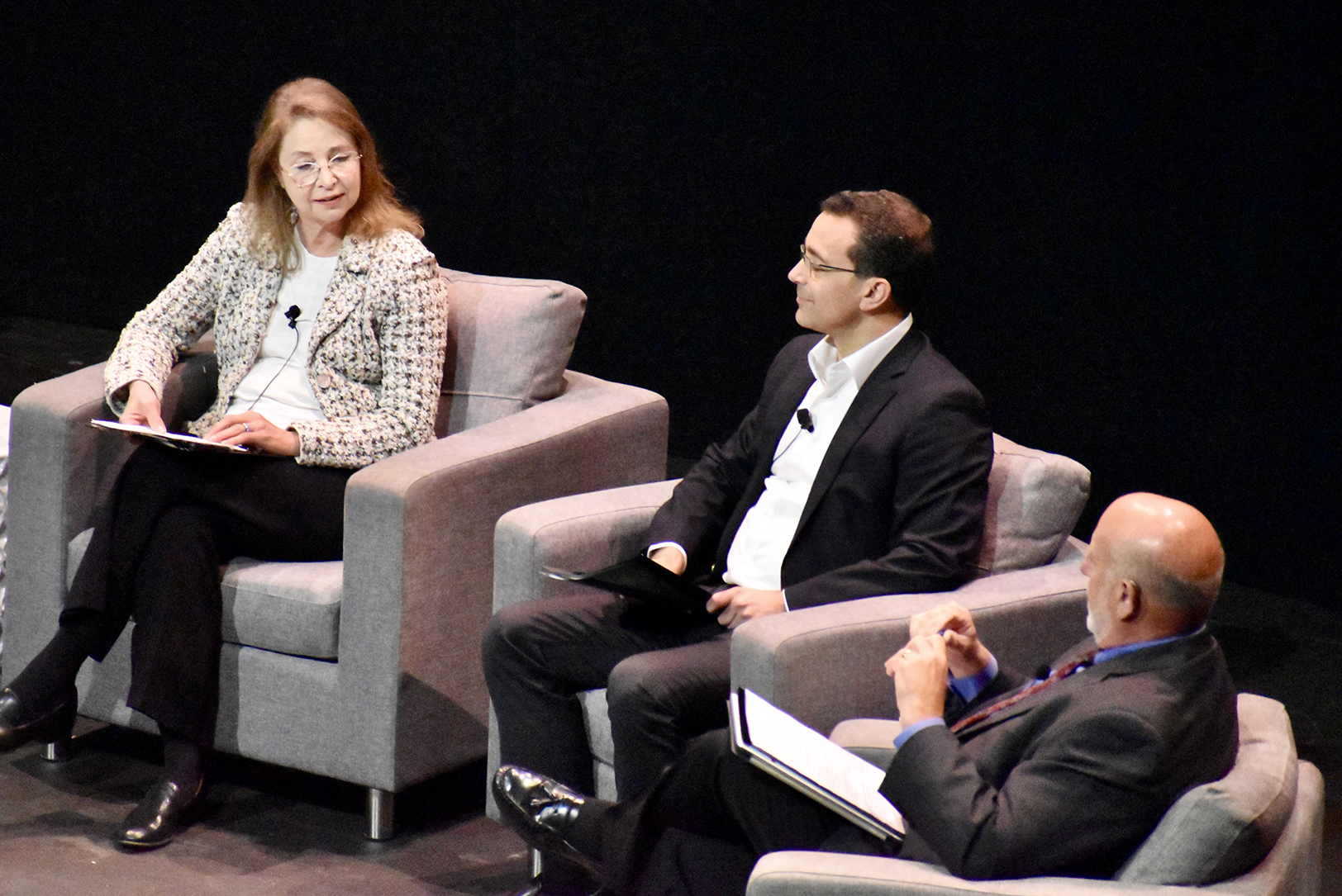 Tammie Wahaus, ELIAS Animal Health, chats with fellow panelist Dr. Todd Zion, Akston, and moderator Dr. Thomas D. Overbay at the Animal Health Summit in Kansas City; photo by Nikki Overfelt Chifalu, Startland News