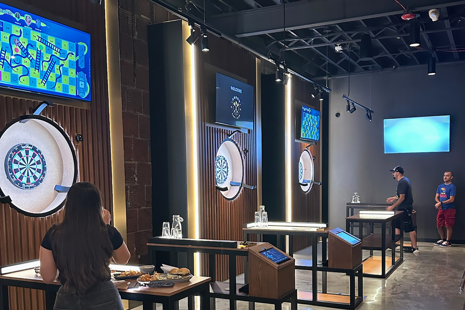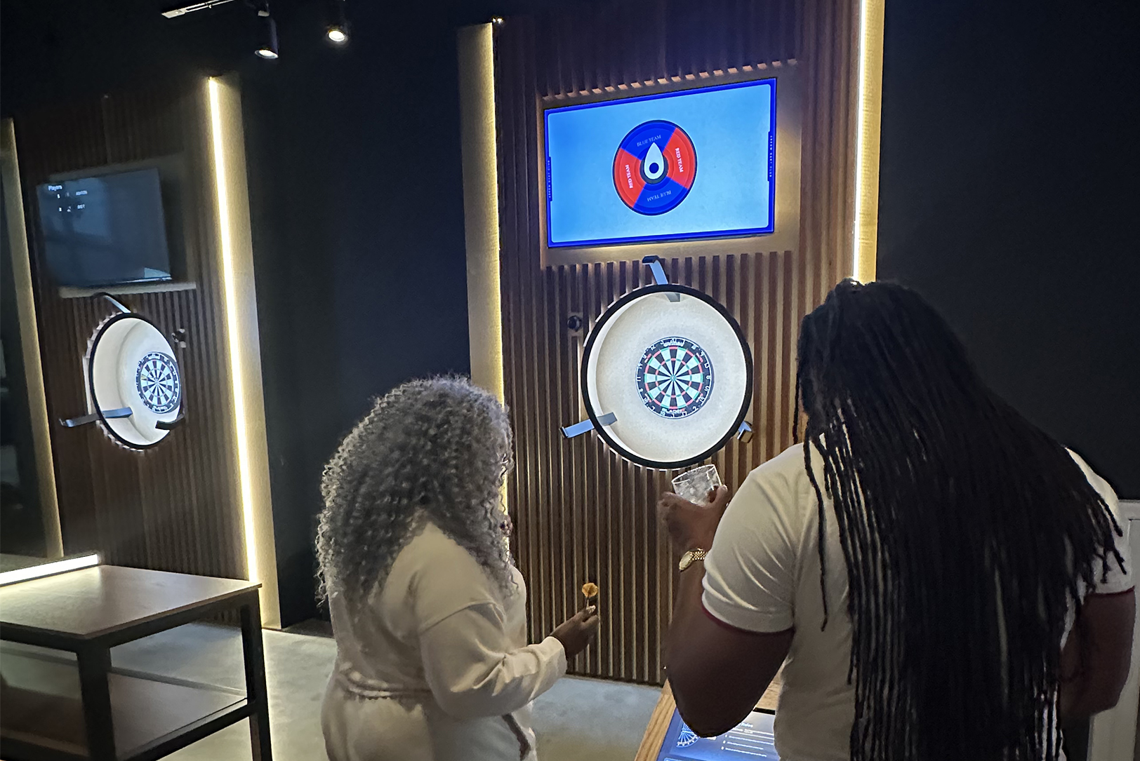 A new, multi-level Crossroads entertainment venue combines the nostalgia of basement darts with tech-driven scoring, elevated eats, and a subterranean wine bar. It’s an experience that feels familiar, but hits a whole new target, said owners Atit and Jugal Patel.