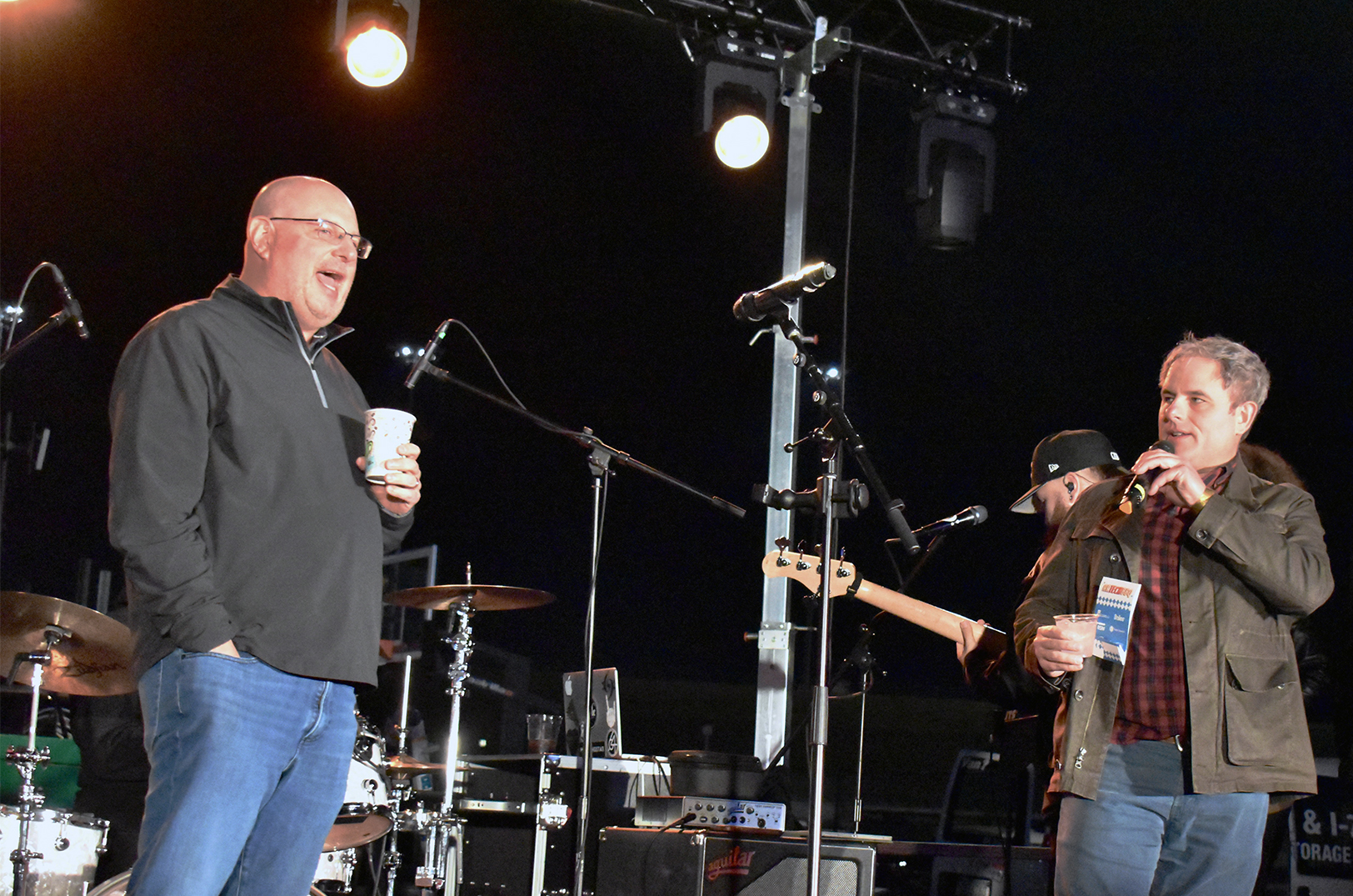 Greg Kratofil, Polsinelli, and Michael Graber, RSM, speak from the stage during the ARtechBBQ; photo by Nikki Overfelt Chifalu, Startland News