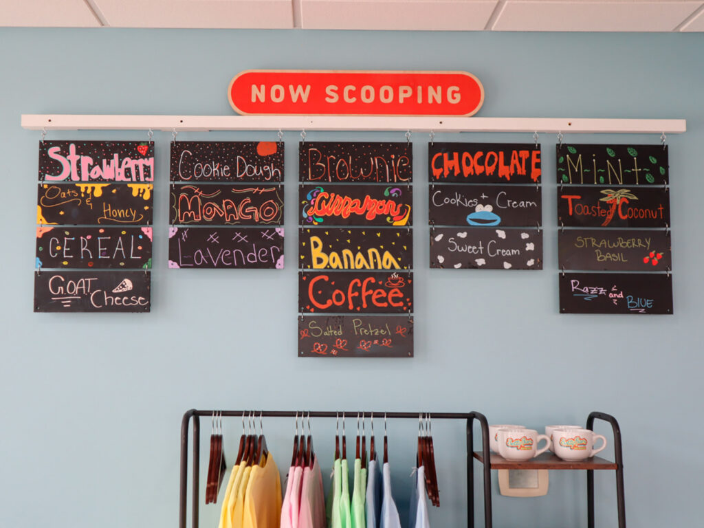 The menu also includes waffle cones, ice cream sandwiches, shakes, sundaes, and ice cream flights. It recently introduced a vegan and gluten-free cone to go with its vegan and dairy-free ice cream options. Customers also can pick up 4-ounce containers (with a wooden spoon), pints, quarts and gallons of its ice cream at the stores.