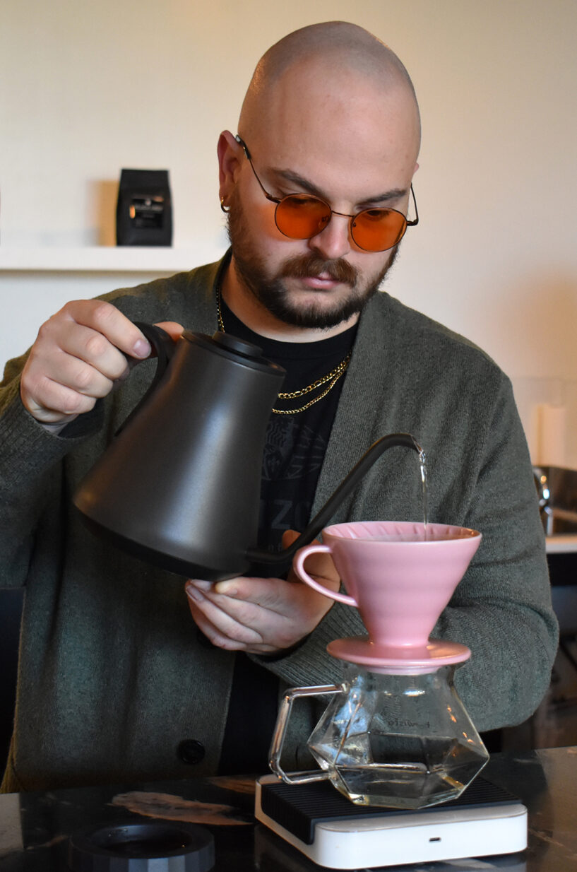 Jacob Kingsley makes a pour-over coffee, using his brand Flowstate Coffee at the new The Black Pantry-Good Karma space; photo by Taylor Wilmore, Startland News