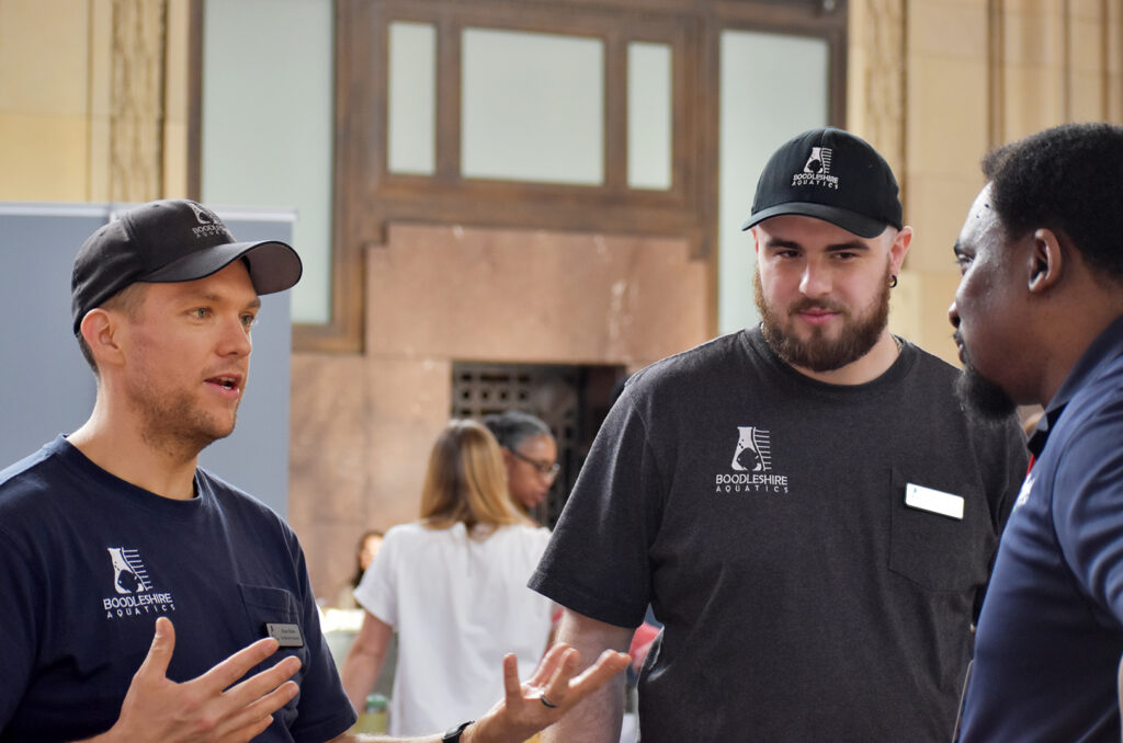 Brian Blake, left, and Aaron George discuss Boodleshire Aquatics with fellow business owners during the KC Chamber’s small business showcase at Union Station; photo by Taylor Wilmore, Startland News