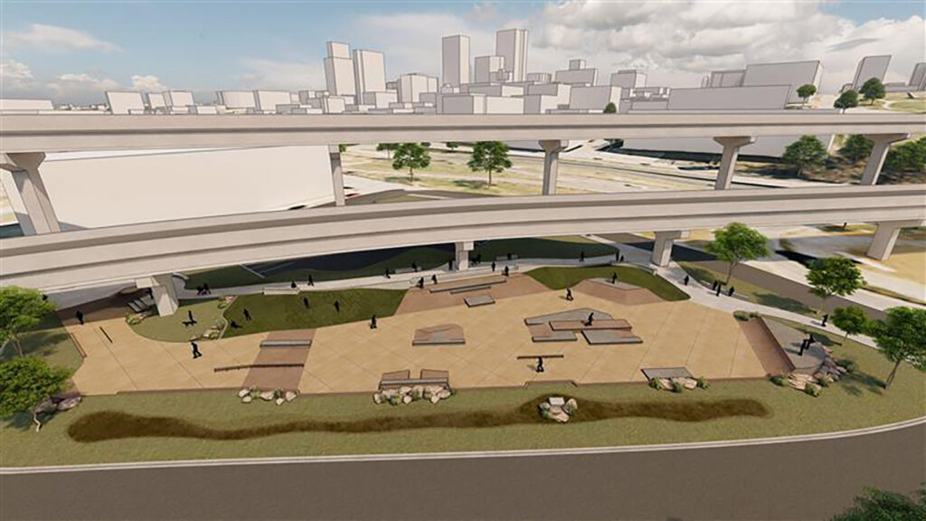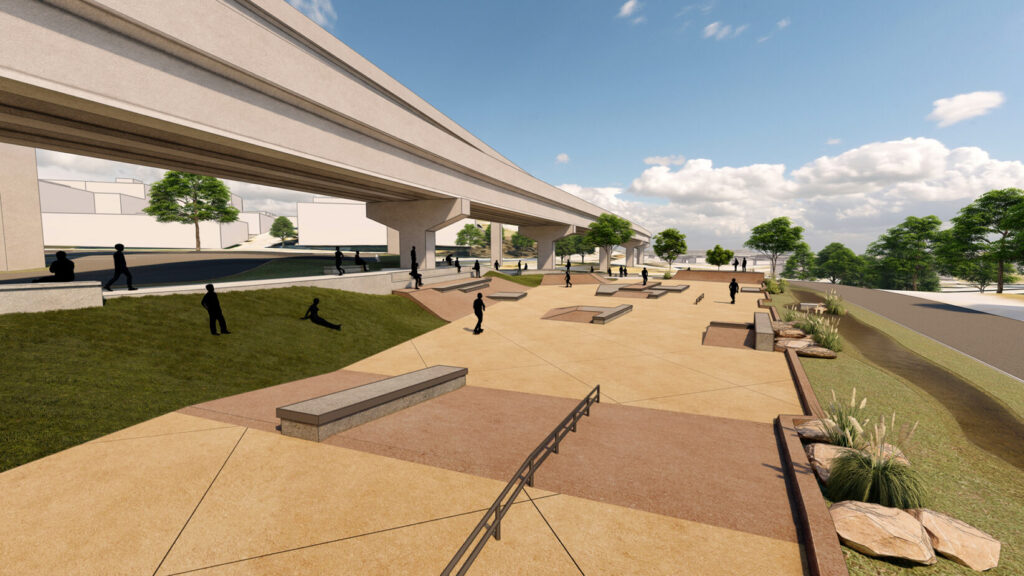 Current plans call for the park, beneath the city’s new, $258 million bridge, to emulate a downtown urban plaza, mixed with banks and transitions that keep the flow moving for skateboarders, bikers, and roller skaters, Russell said.