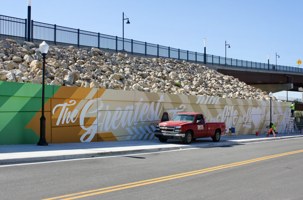 Phil “Sike Style” Shafer and a team from Sike Style Industries work on a mural along the south end of the Buck O’Neil Bridge; photo by Nikki Overfelt Chifalu, Startland News