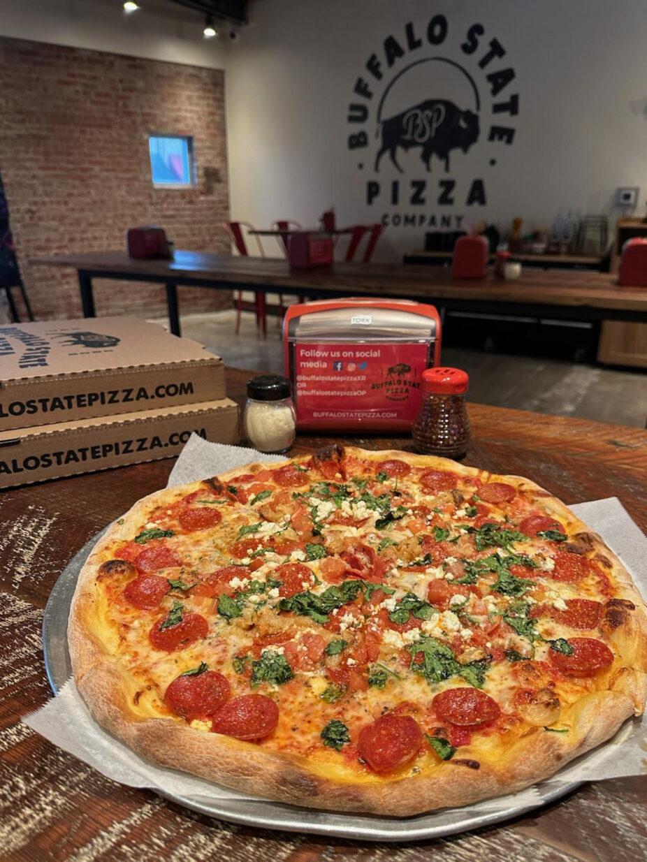 A couple years later, when the Papa Keno’s licensing agreement expired, they broke away from the brand and created their own — Buffalo State Pizza Co. — in a nod to the official state animal of Kansas.