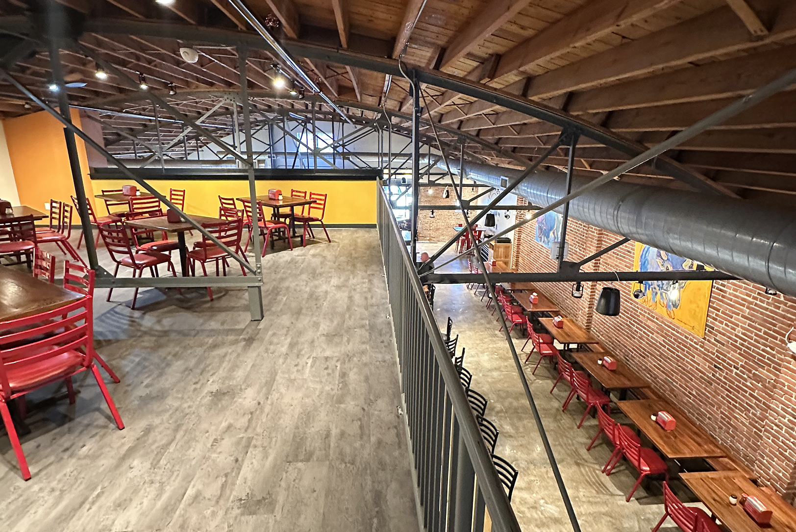 They next spent $400,000 on the build-out — dining room, full bar, new kitchen, dedicated to-go area, and more room for live entertainment. The upstairs mezzanine overlooks the dining area and can seat up to 50 people.