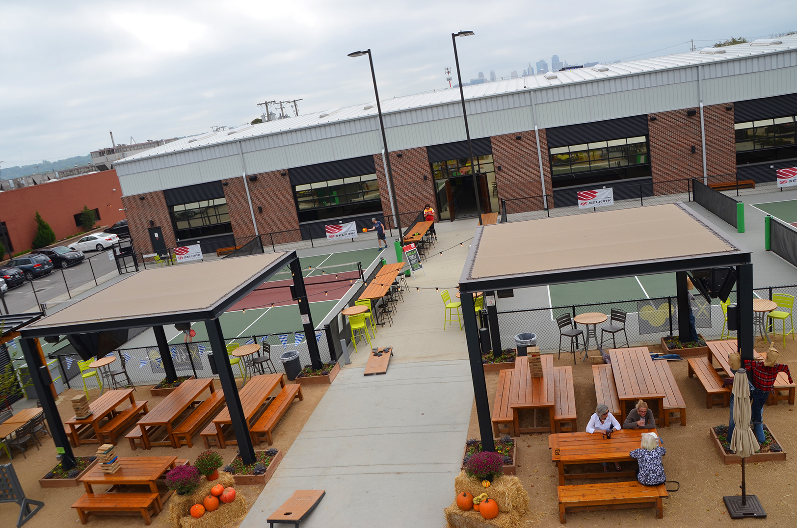 “You can get your workout in and eat,” she said of the restaurant, bar and indoor/outdoor complex that boasts eight courts and plenty of room for cornhole and other games.