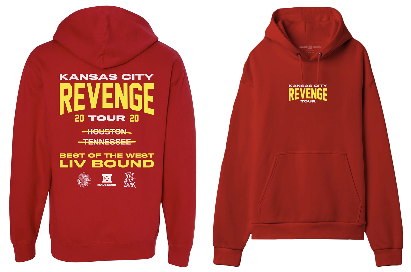The theme behind MADE’s Chiefs-centered apparel represents a “tour merch” aesthetic, dubbed, “Revenge Tour,” Launiu explained, with the apparel signifying the Chiefs going throughout the season defeating all the teams that beat them in previous games.