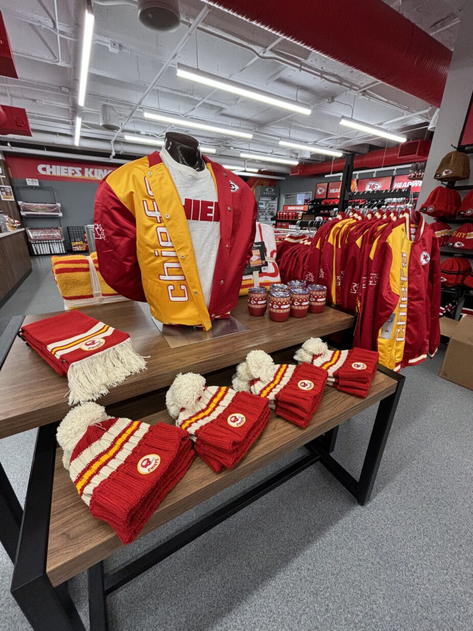Chiefs merchandise — including beanies and scarves inspired by the Hallmark Channel movie “Holiday Touchdown: A Chiefs Love Story” — for sale at the Chiefs Pro Shop in Arrowhead Stadium; photo courtesy of Aramark