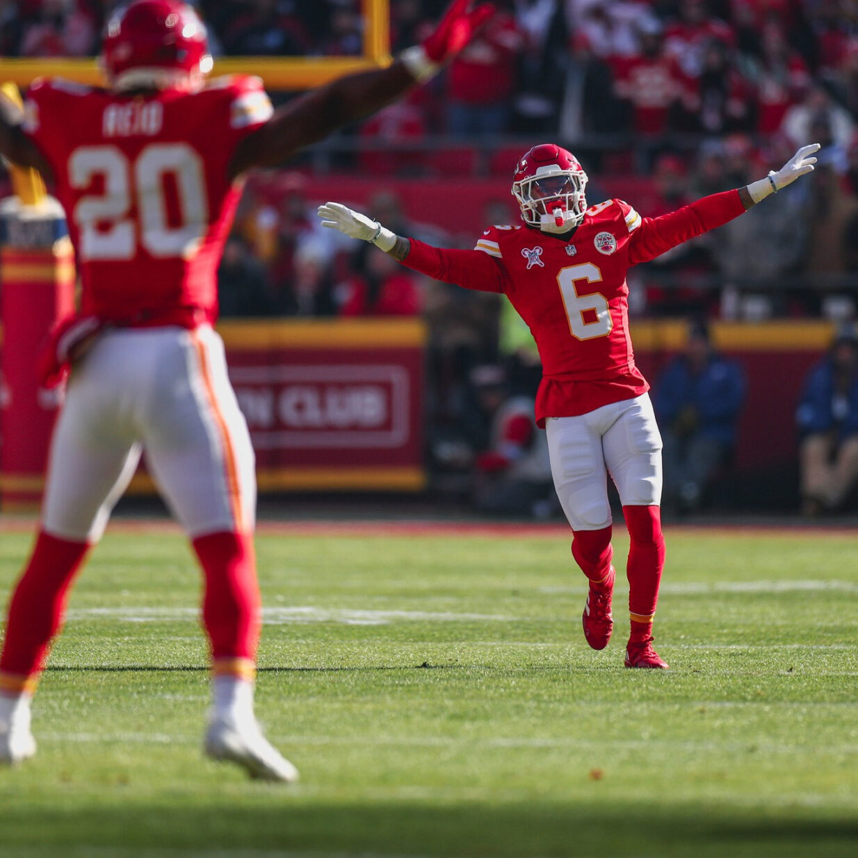 Chiefs safeties Bryan Cook and Justin Reid celebrate during Kansas City’s 27-19 victory over the Houston Texans Dec. 21 — their last game at Arrowhead Stadium before the playoffs; photo courtesy of the Kansas City Chiefs