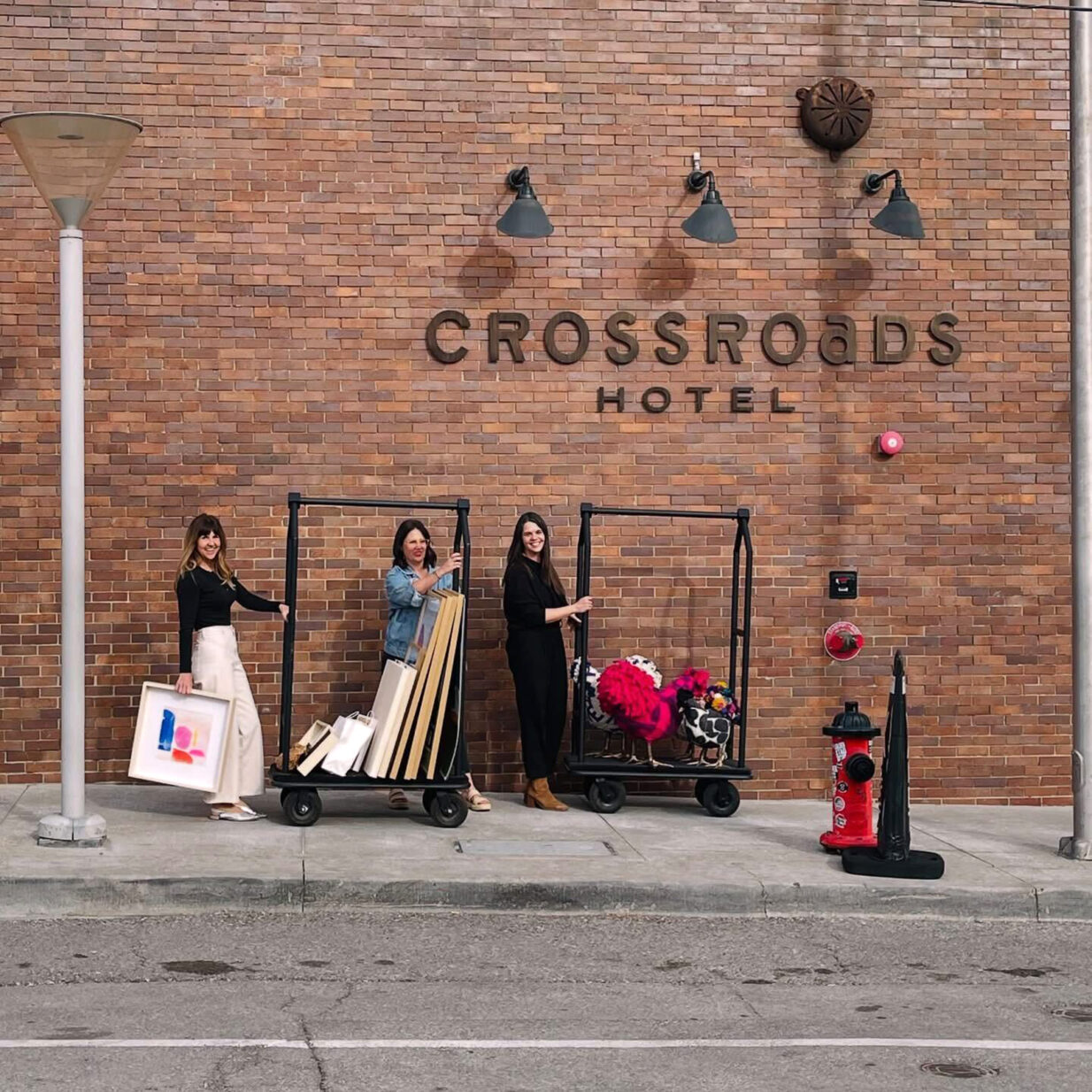 Morgan Georgie and Carrie Kiefer, Ampersand Design Studio, with Carly Pumphrey, The City Girl Farm, transport chicken footstools into a gallery space within the Crossroads Hotel; courtesy photo