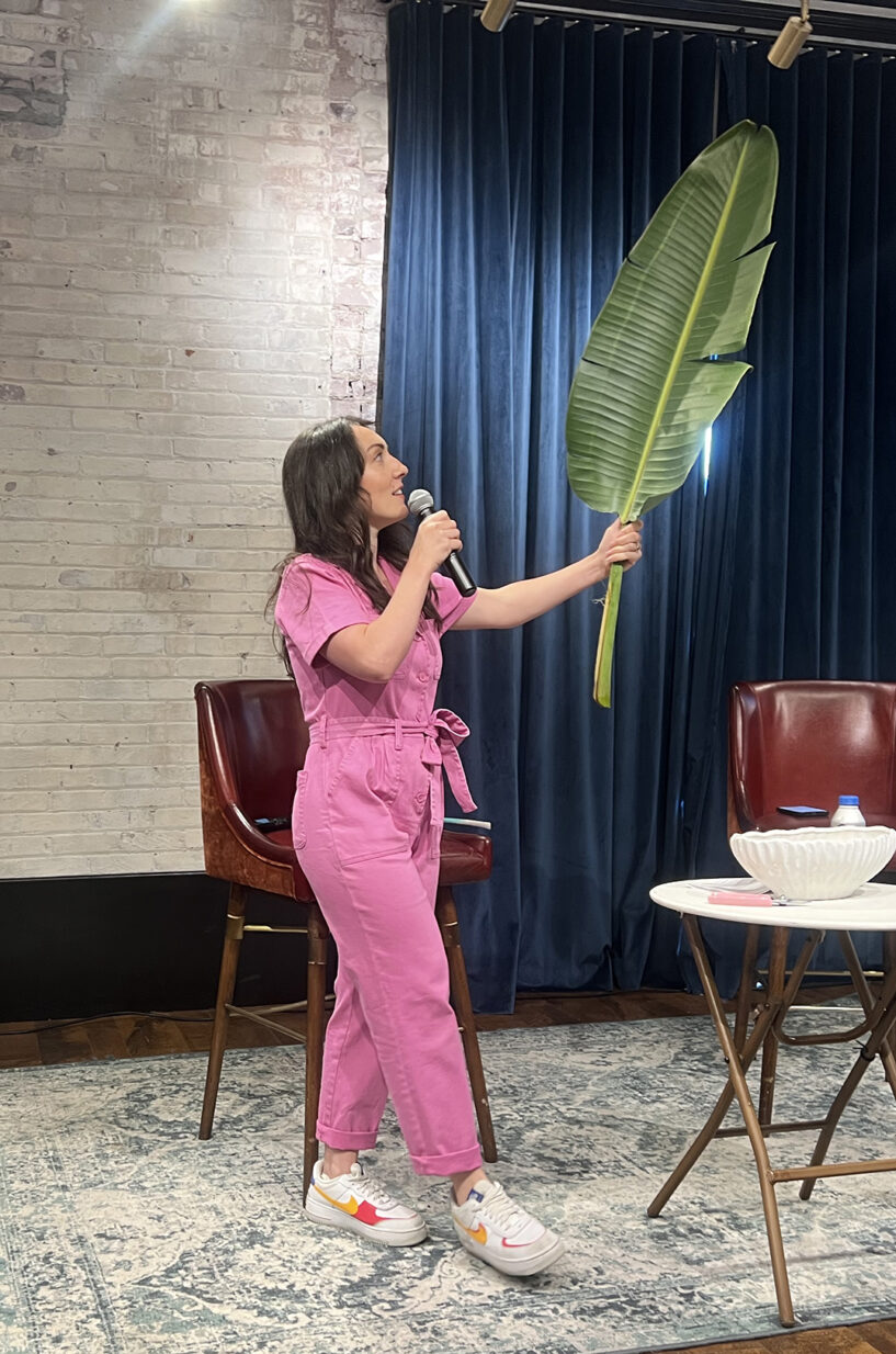 Colleen Robertson, Floraloom, holds a bird of paradise leaf during her presentation at CreativeMornings KC; photo by Taylor Wilmore, Startland News