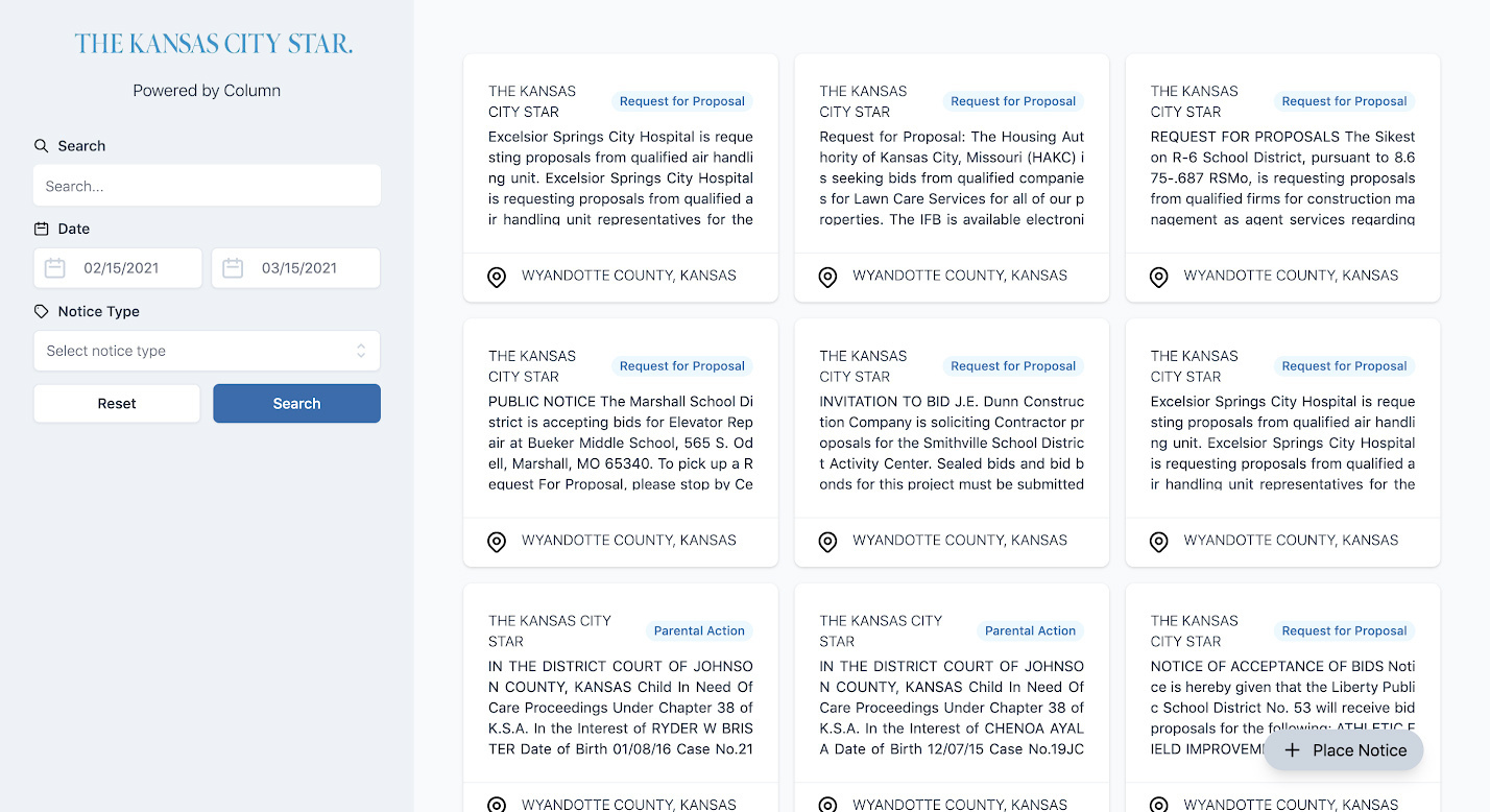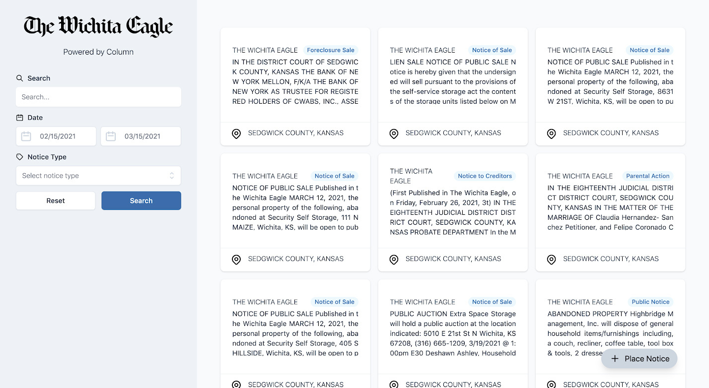 “We are used by media businesses that have to work back and forth with local government officials. [Column] is a suite of tools that helps the media business administer the public notice process with all their customers,” Seaton explained, noting that when he spoke to those who worked with his family’s newspapers — notably including the Manhattan Mercury — they shared their pain points around the process and requirement of public notice.