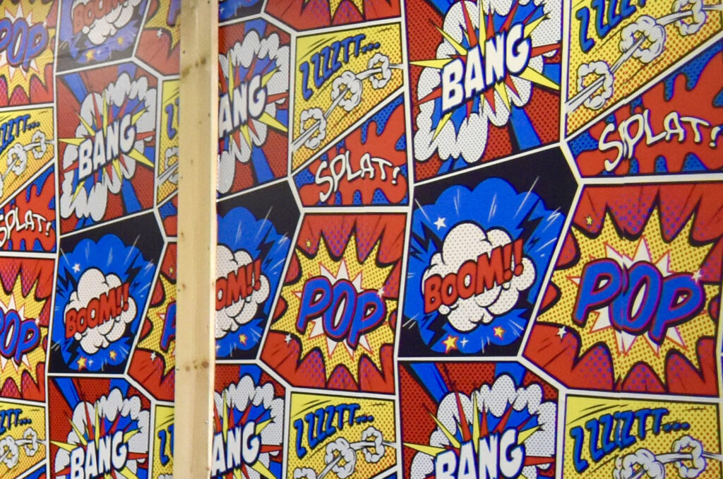 An accent wall at Comic Coffeehouse in Olathe features comic book imagery; photo by Nikki Overfelt Chifalu, Startland News