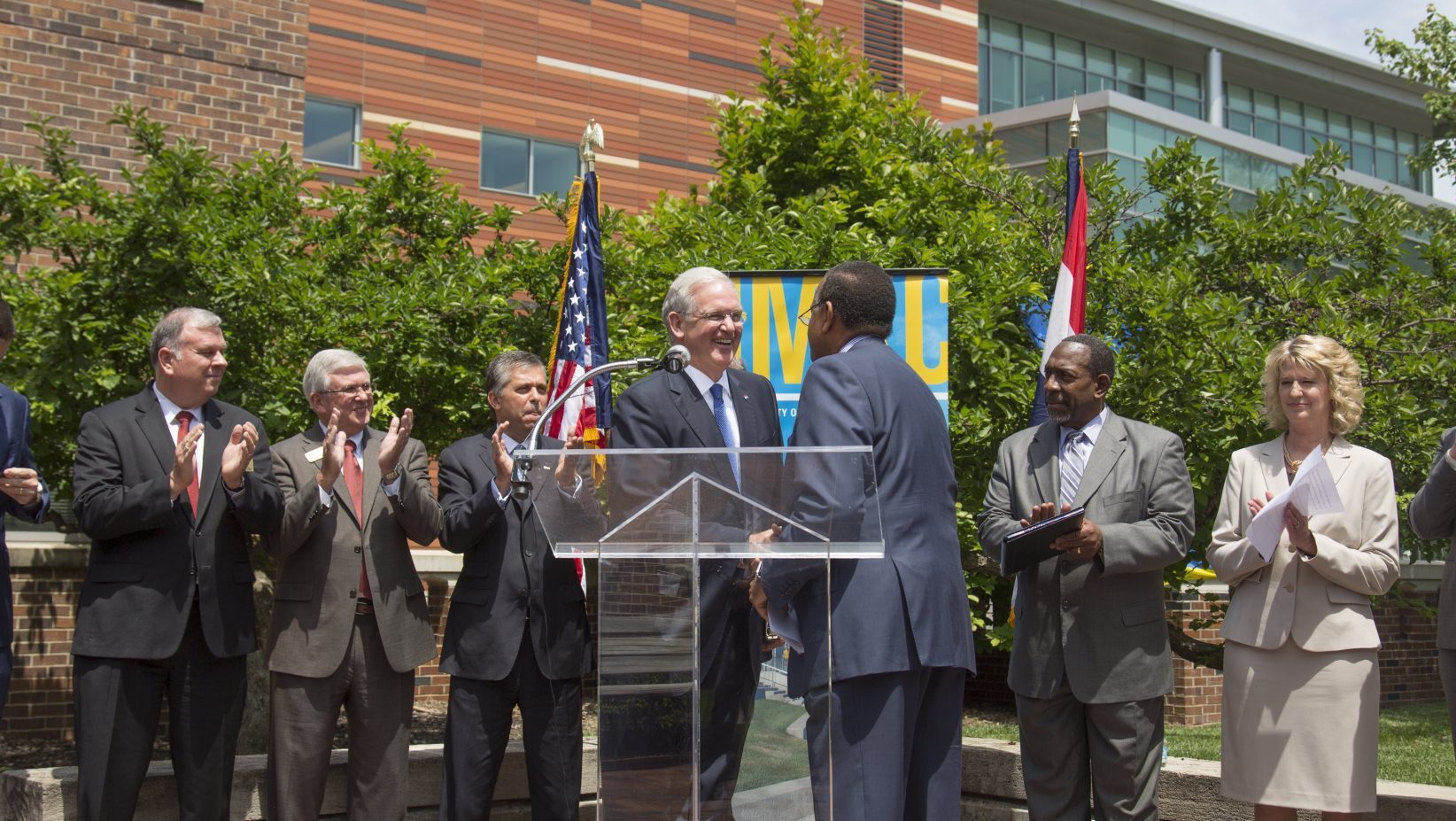 Missouri Gov. Jay Nixon shakes hands with UMKC Chancellor Leo E. Morton. Photo by Janet Rogers/UMKC.