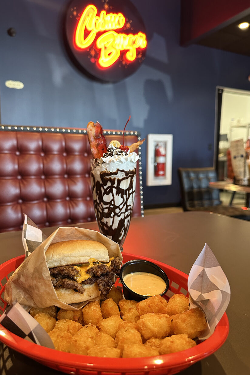 Smash burger, tater tots and milkshake at Cosmo Burger XR in the East Crossroads; photo by Joyce Smith