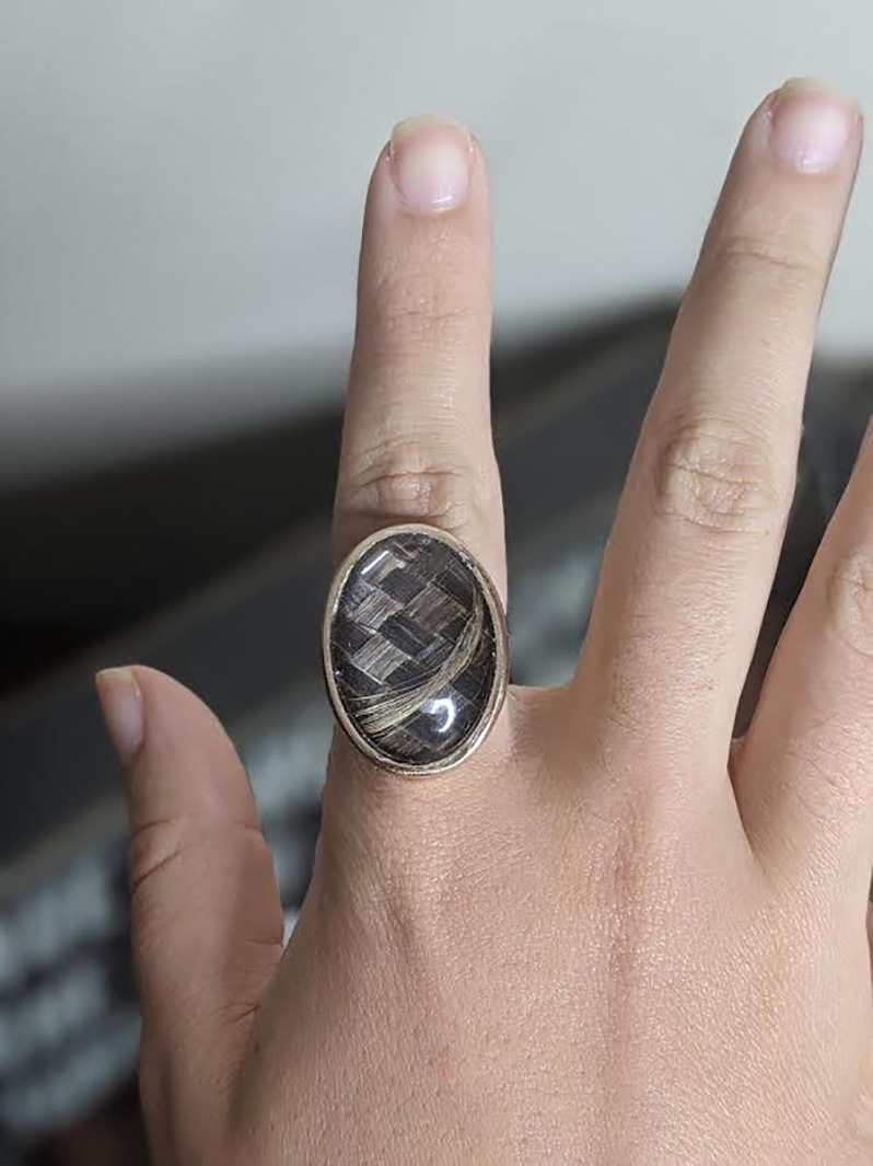 A family hair ring featuring a basketweave pattern of a mother’s and father’s hair with a lock of baby’s first haircut overtop; photo courtesy of Never Forgotten