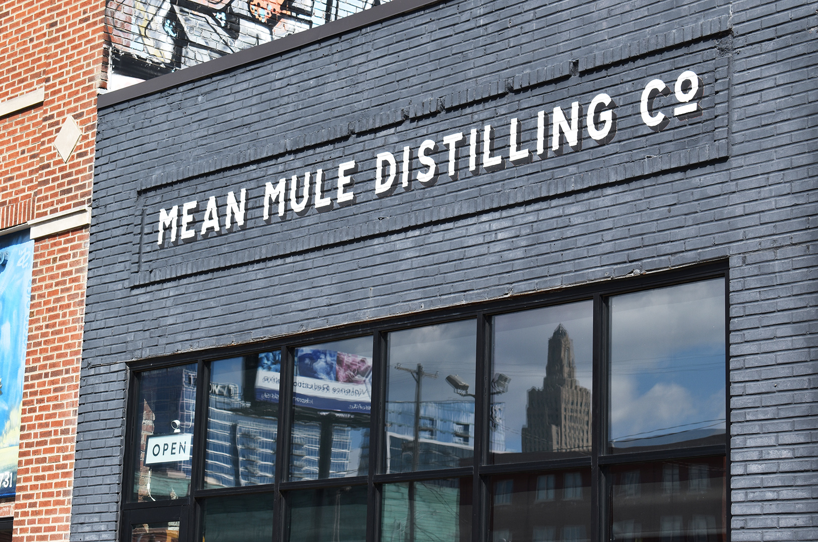 Mean Mule Distilling Co. sits in the Crossroads, reflecting a portion of the former Kansas City Star building, which would have been part of the primary footprint of the Kansas City Royals’ Crossroads baseball stadium; photo by Taylor Wilmore, Startland News