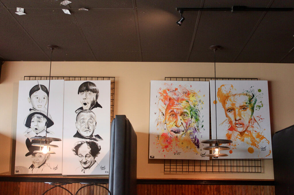 Paintings by David Alston feature the faces of The Three Stooges, Albert Einstein, and Elvis; photo by Nikki Overfelt Chifalu, Startland News