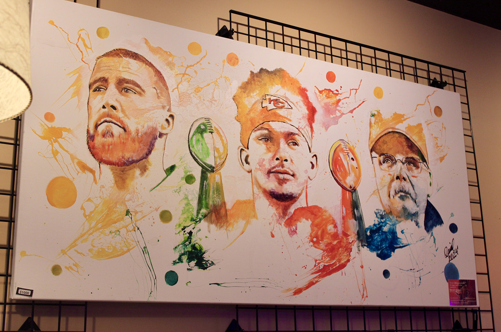 A painting by David Alston featuring Kansas City Chiefs’ Travis Kelce, Patrick Mahomes and Andy Reid; photo by Nikki Overfelt Chifalu, Startland News