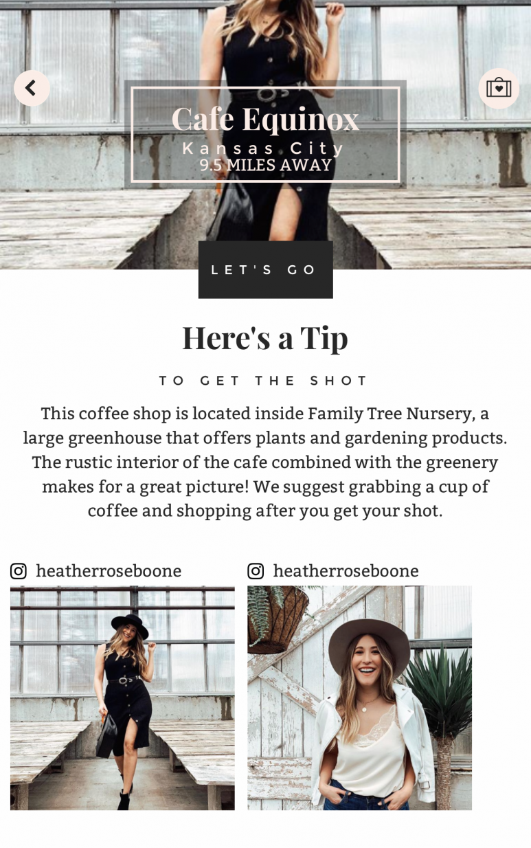 A frequent traveler herself, Aneloski knows the struggles of trying to maintain a social media presence on the go — especially when unfamiliar with the local surroundings, she said. While on a trip to Sedona, Arizona, a couple years ago, she realized the potential for a wayfinding app that could point people to the perfect settings.